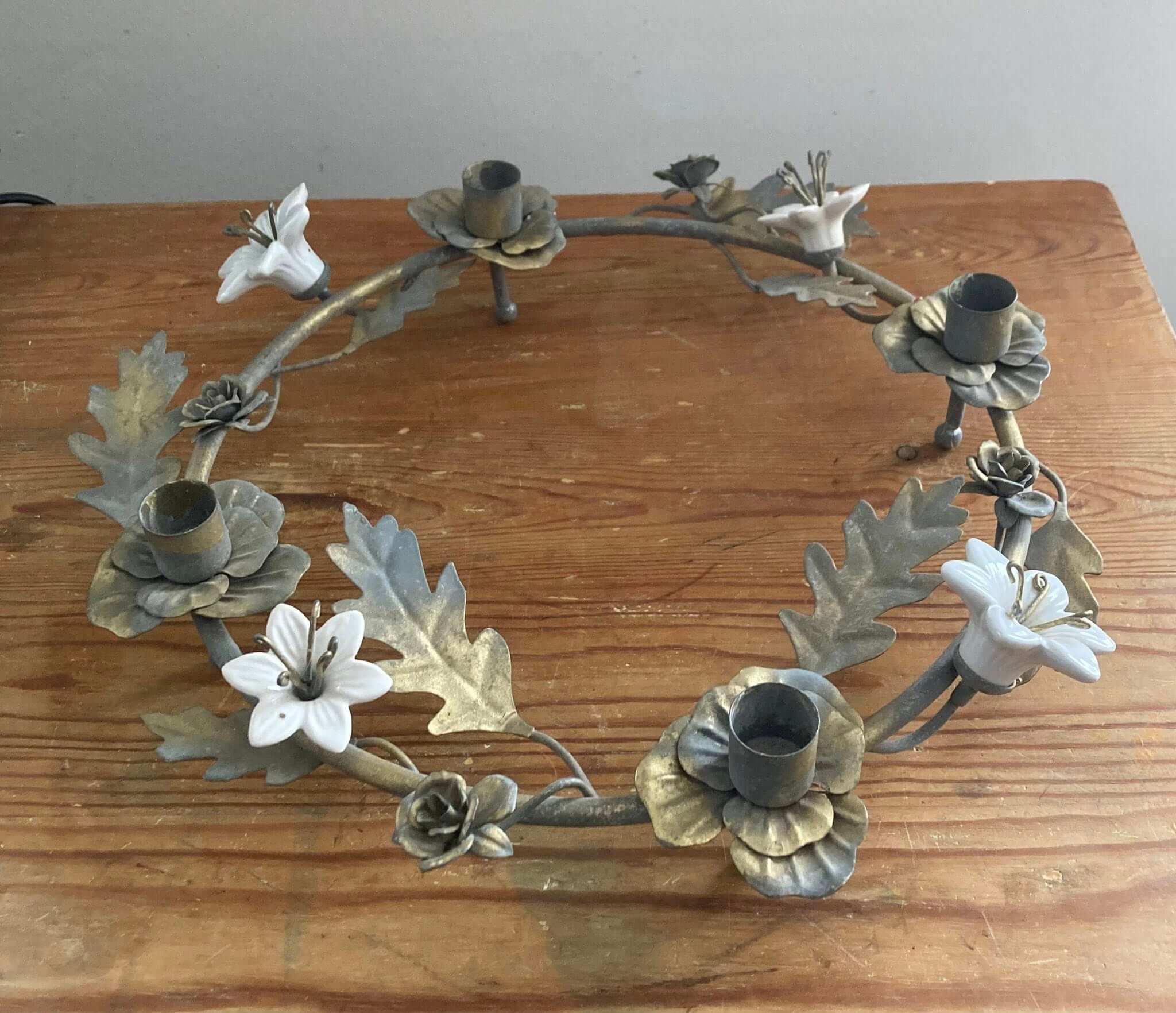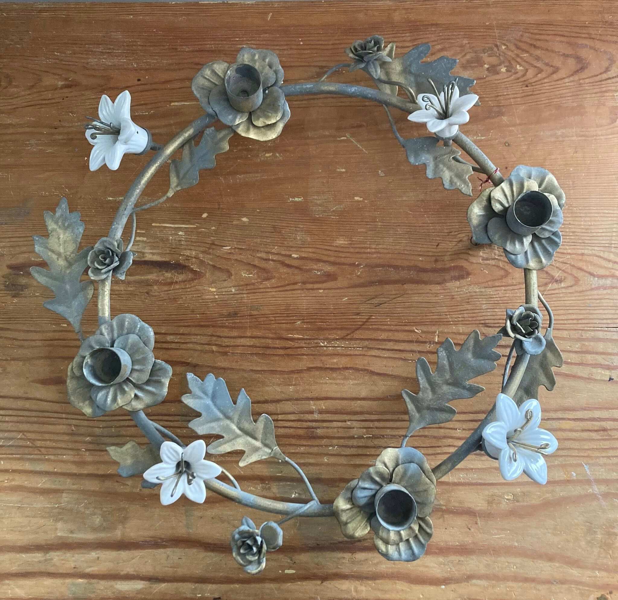 Nyere stage der ser gammel ud. Lysestage til 4 store lys, behøver ikke kun at bruges til advent. Den er lavet i Zink tror jeg med porcelæns blomster. Den er 40 cm Ø