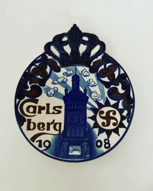 Carlsberg platte fra Aluminia . Den måler 26 x 22 cm. . Den har desværre en revne, men kan sagtens hænge. 450kr