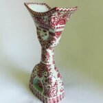 Fin rød Bjørn Winblad lysestage, med mand på den ene side og kvinde på den anden. 23 cm højL Den har en revne, som ikke gennemgående.