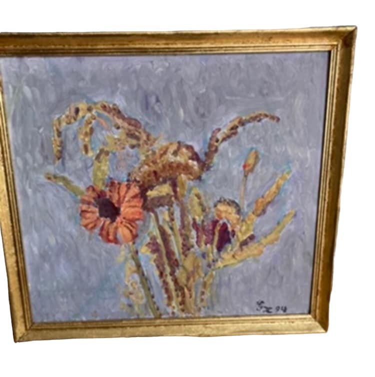 lidt naivistisk pointalisme i skønne farver. i guldramme som måler 43 x 39,5 cm.