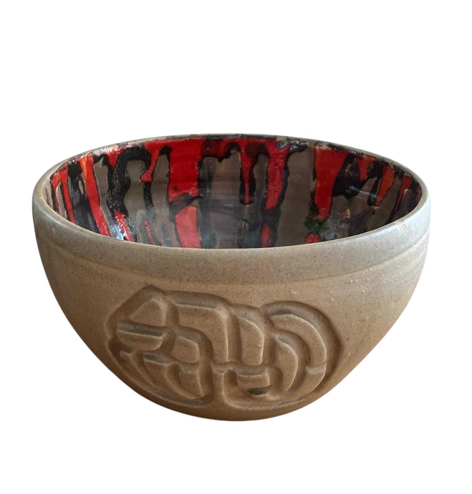Conni David’s Bowl Conni Davids is a Danish female ceramicist.. Davids was apprenticed to Finn Lynggard, where she taught raku firing, but also how to experiment with glazes. This bowl has brown, red and black icing and a “Celtic” pattern in 2 places. It measures 11 cm h and is 20 cm ø.