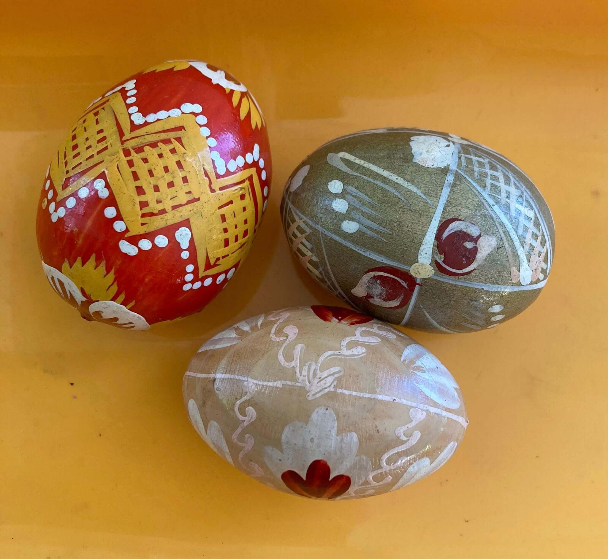 Smukt dekorerede æg i træ til at pynte på påskebordet. Prisen er for alle 3.