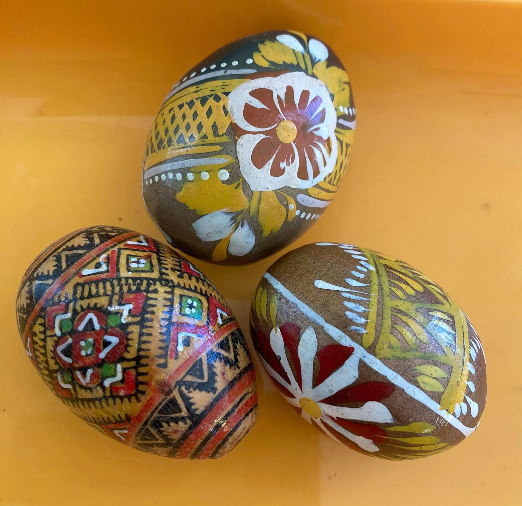 Smukt dekorerede æg i træ til at pynte på påskebordet. Prisen er for alle 3.