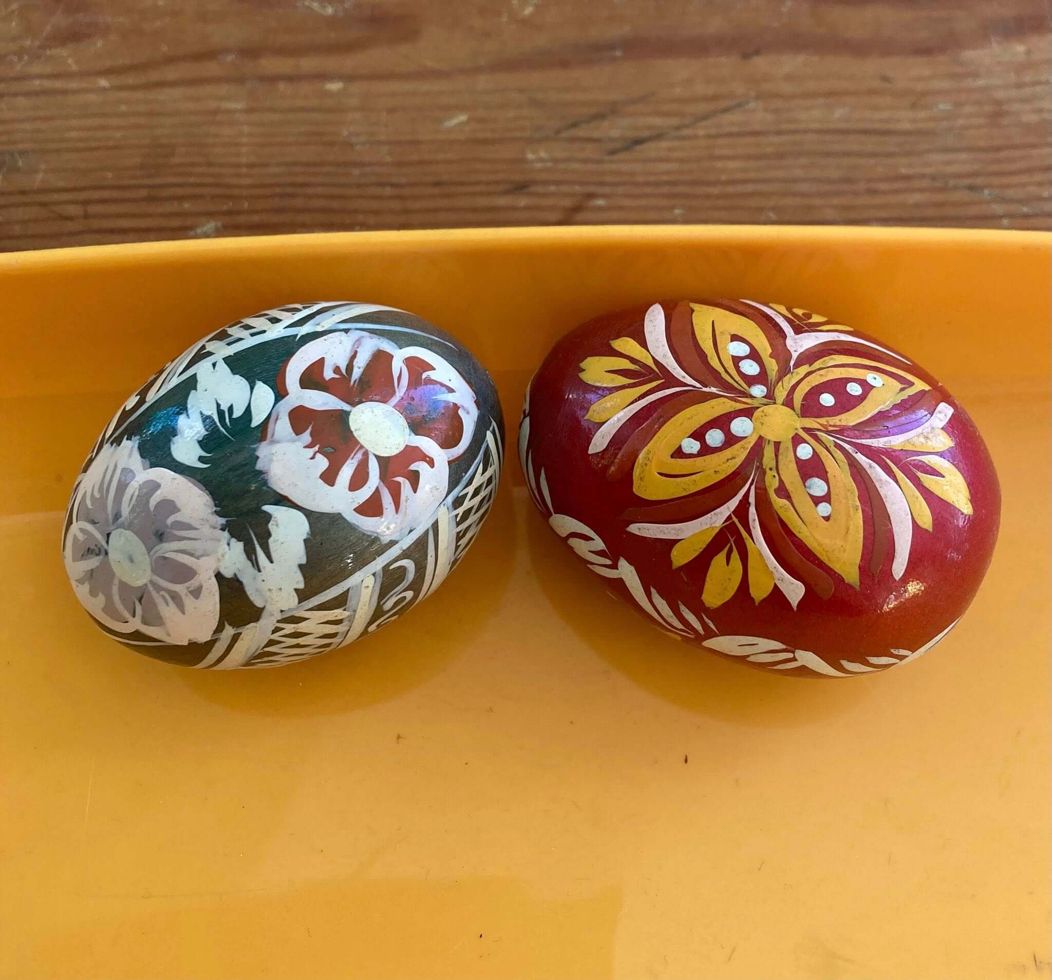 Smukt dekorerede æg i træ til at pynte på påskebordet. Prisen er for begge to.