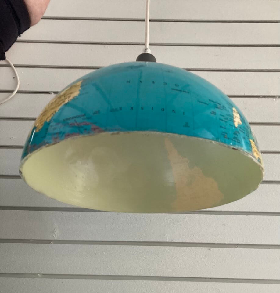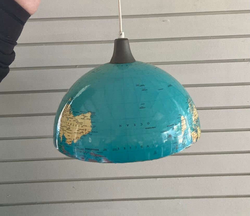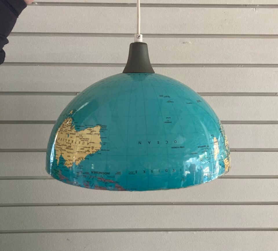 Nogen har været så – syntes jeg_ geniale at halvere en globus og lavet en loftslampe, denne er 30 cm ø og 20 cm høj uden fatning.