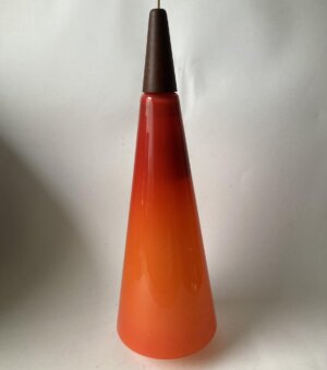 Åh den er faaantastisk Holmegaard lampe ca. 1960 orange chancernes over i rød, med teak top, i typiske farver fra Palet serien. . 38 cm fra trak spids til bund af glas . 1050kr glæder mig til at se den med lys i .