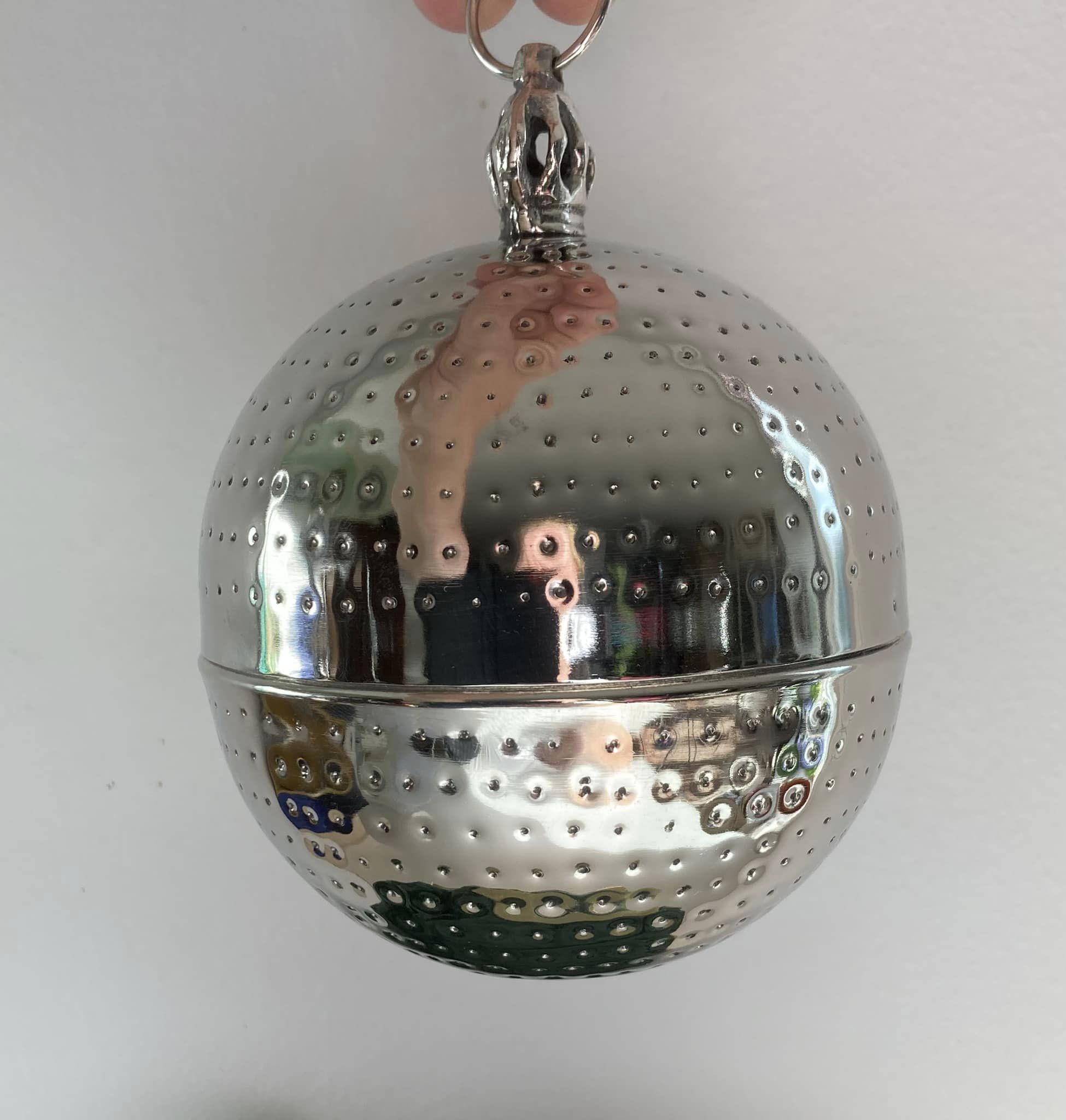 Kæmpe julekugle i “sølv” den er vel 14 cm ø. Der medfølger kasse og guldbånd. 150 kr