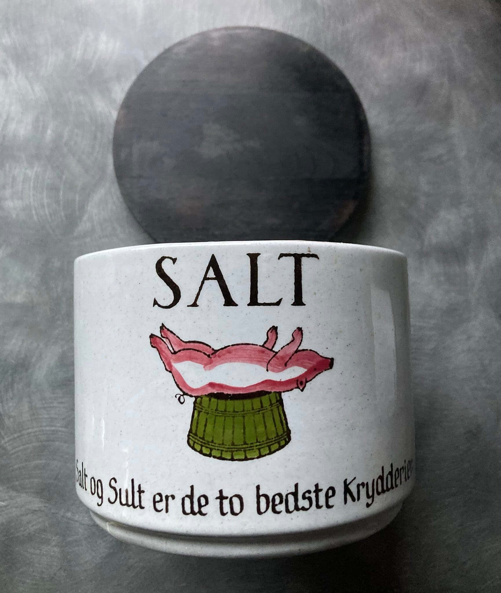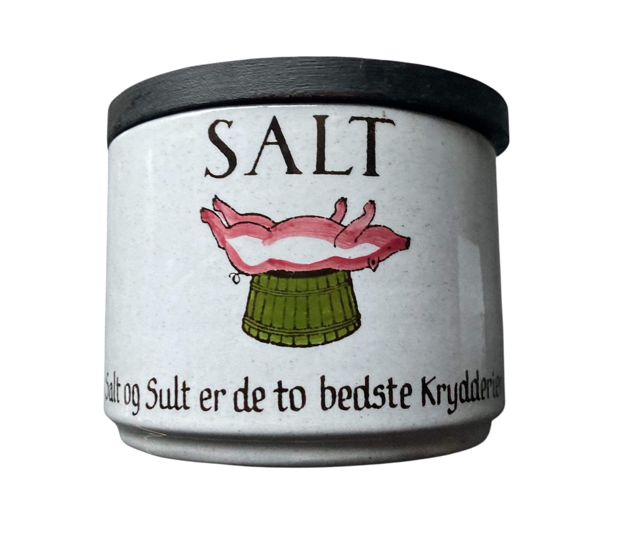 Saltkar med træ låg fra Knapstrup ordsprogsserien, den er limet i et lille hjørne bag på.