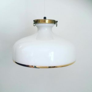Og så en ordentlig fætter i opal glas. Hvid med guldkant, har fået ny ledning . Målet 29 cm Ø og er 20 cm høj. 550kr