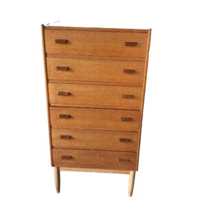 Poul M. Volther for FDB. Kommode med seks skuffer, af fineret teaktræ, stel af massivt egetræ, runde lettere tilspidsede ben. Den måler H. 130, L. 80, D. 43 cm. Har brugsspor, men ingen store skader.