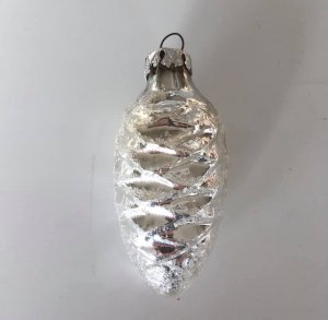 Fin hvid/sølv farvet jule kogle, som måler 8 cm