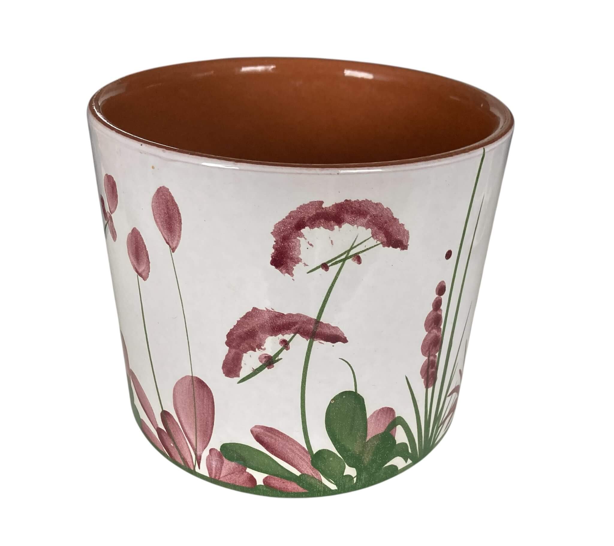 Mellemstor urtepotteskjuler fra WG med lyserøde blomster på hvid bund, som måler 14,5 cm Ø og er 15 cm høj.