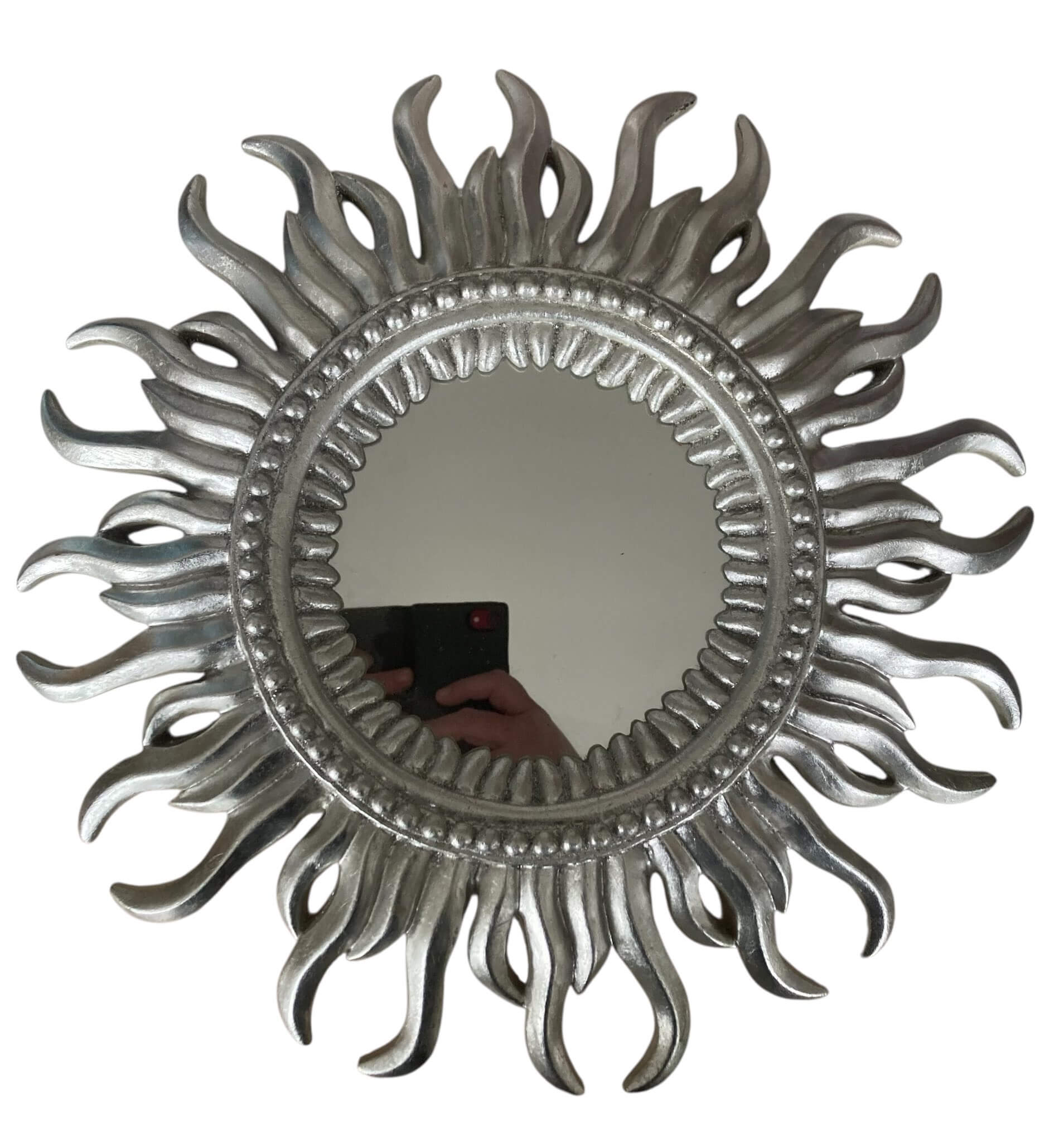 Nyere solspejl i sølvfarvet, som er 40 cm Ø til at hænge på væggen. Kan ses i Gartnerboligen hos Livsstil på Egholmslot.