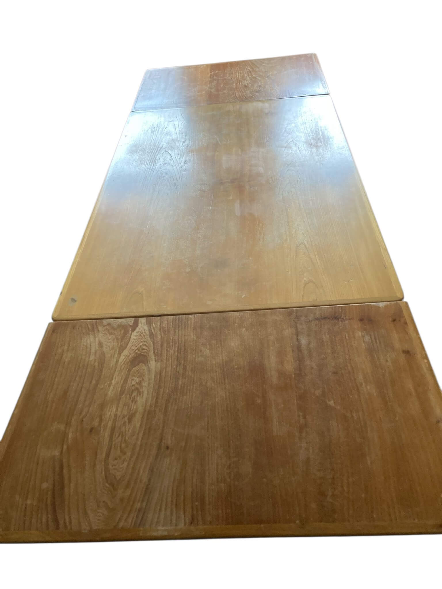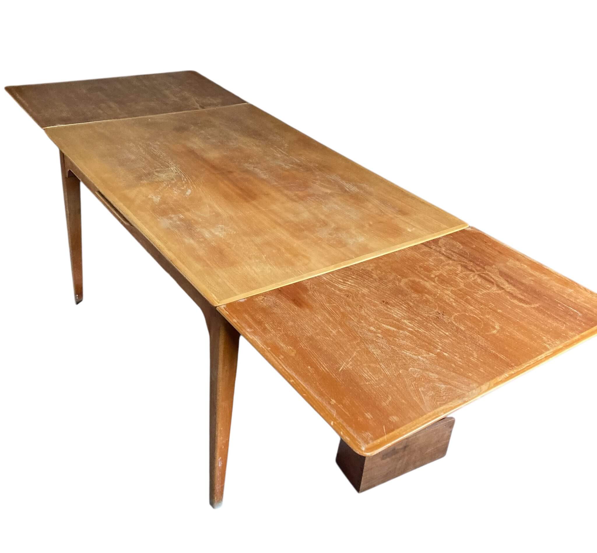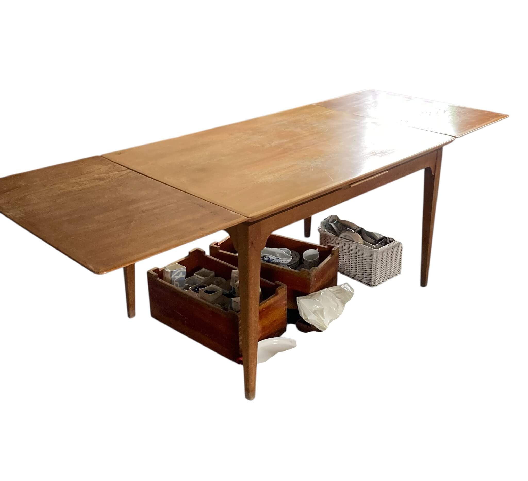 Det har så fine former og udtrækket kører perfekt, men det bør slibes på toppen og olierers op igen. Spisebordet måler fuldt udtrukket 269 cm og er 99 cm B og 73 cm H. Med pladerne inde er det 170 cm B.