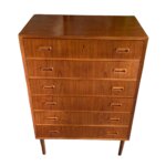 6 skuffers kommode i teak, med mindre skavanker, så som et afslag på et skuffe håndtag og finer afskalninger under skuffe. Ingen store skader. Den måler 71,5 cm b x 39,5 cm d og er 106,5 cm h. 1450kr
