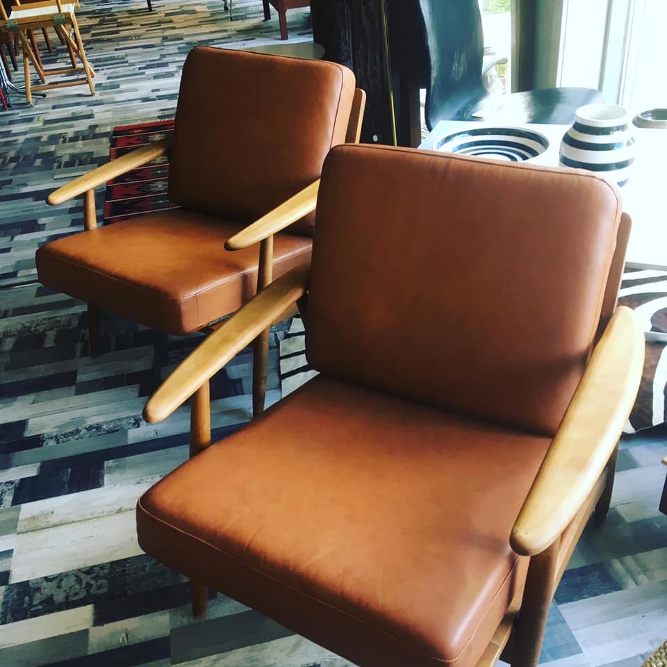Feeede lænestole i teak med cognac farvet skind . 3000,- stk. 2 stk haves