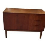 Teak sideboard small no 1 Really nice small sideboard in teak with “bar cabinet” door goes down and 3 drawers. In reasonable condition. Has a small chip on the handle on the bottom drawer, and the top has rings. It measures 90 cm W, 40 cm D and is 63 cm high. This item will not be shipped, must be picked up in store.