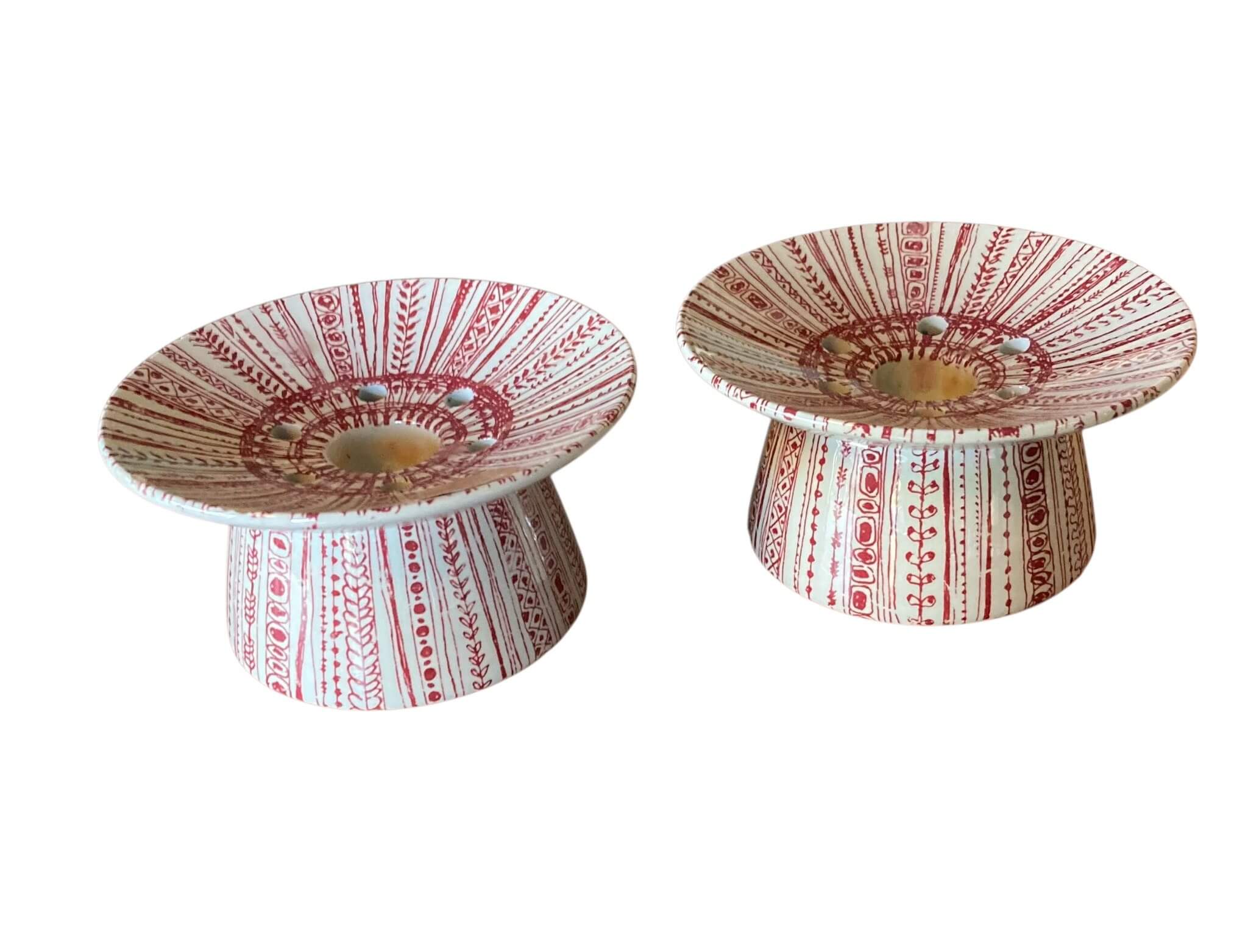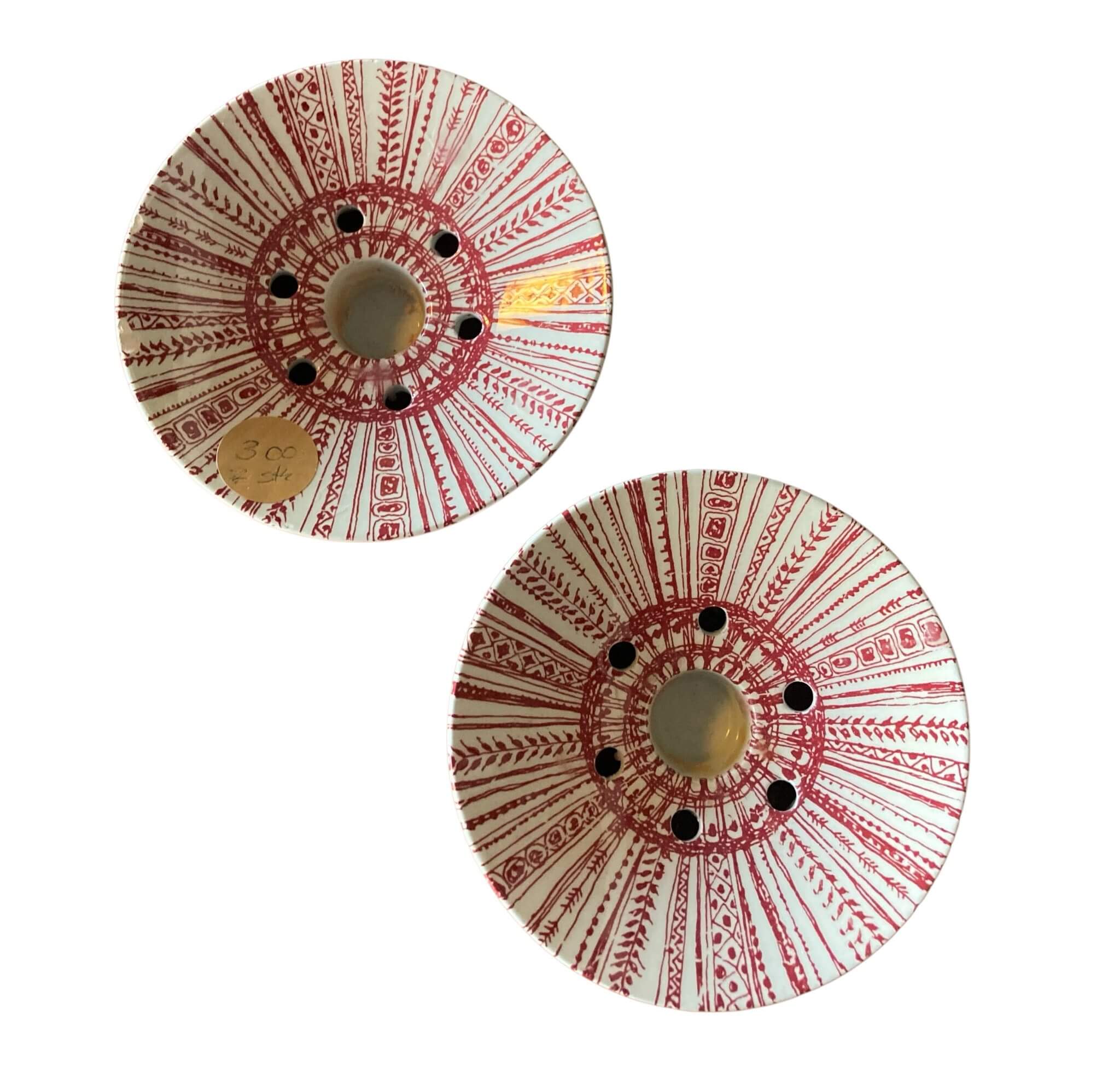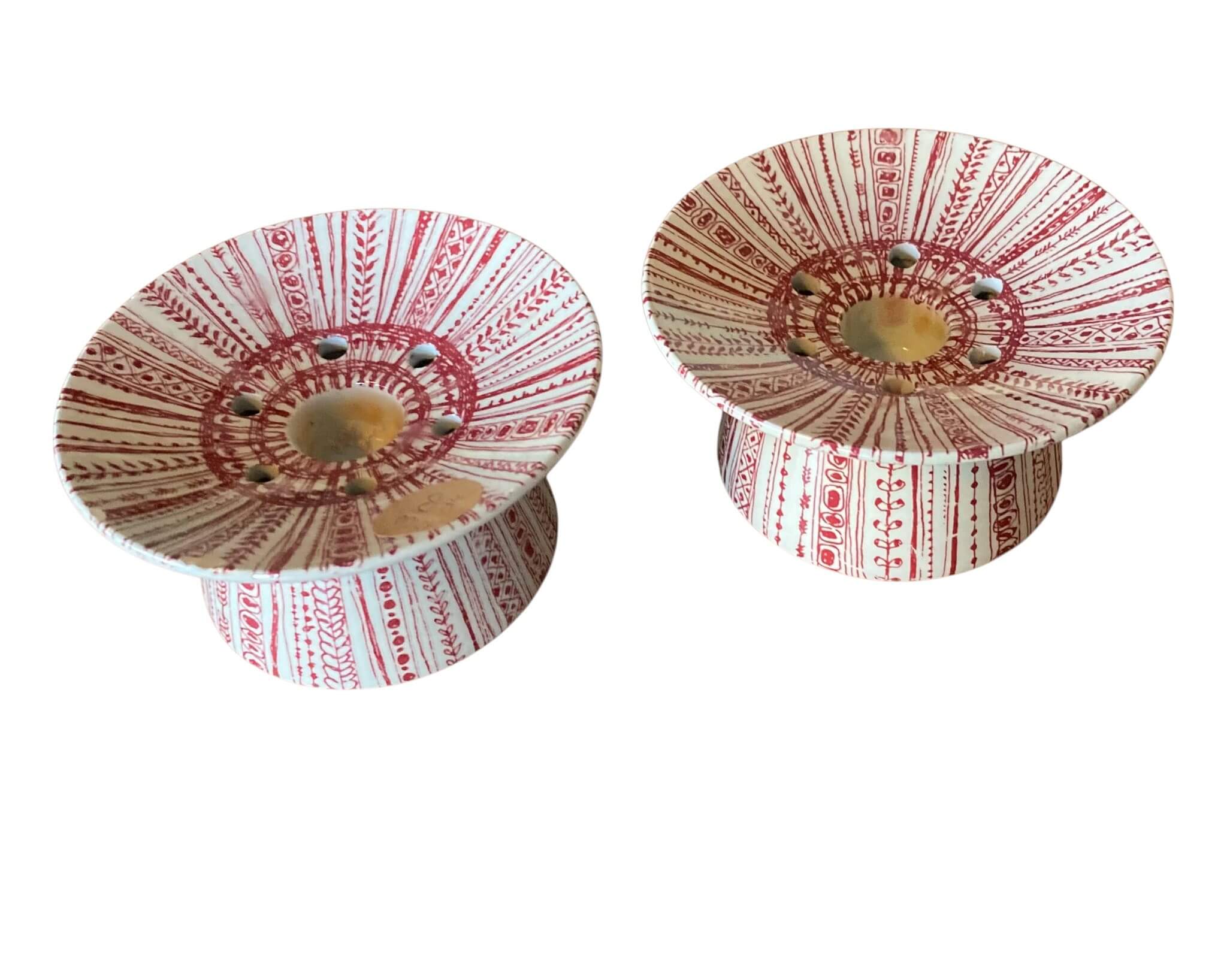 Et par lysestager i rød. . Den ene har et hak deraf prisen, som er for begge. De er 5,5 cm høje.