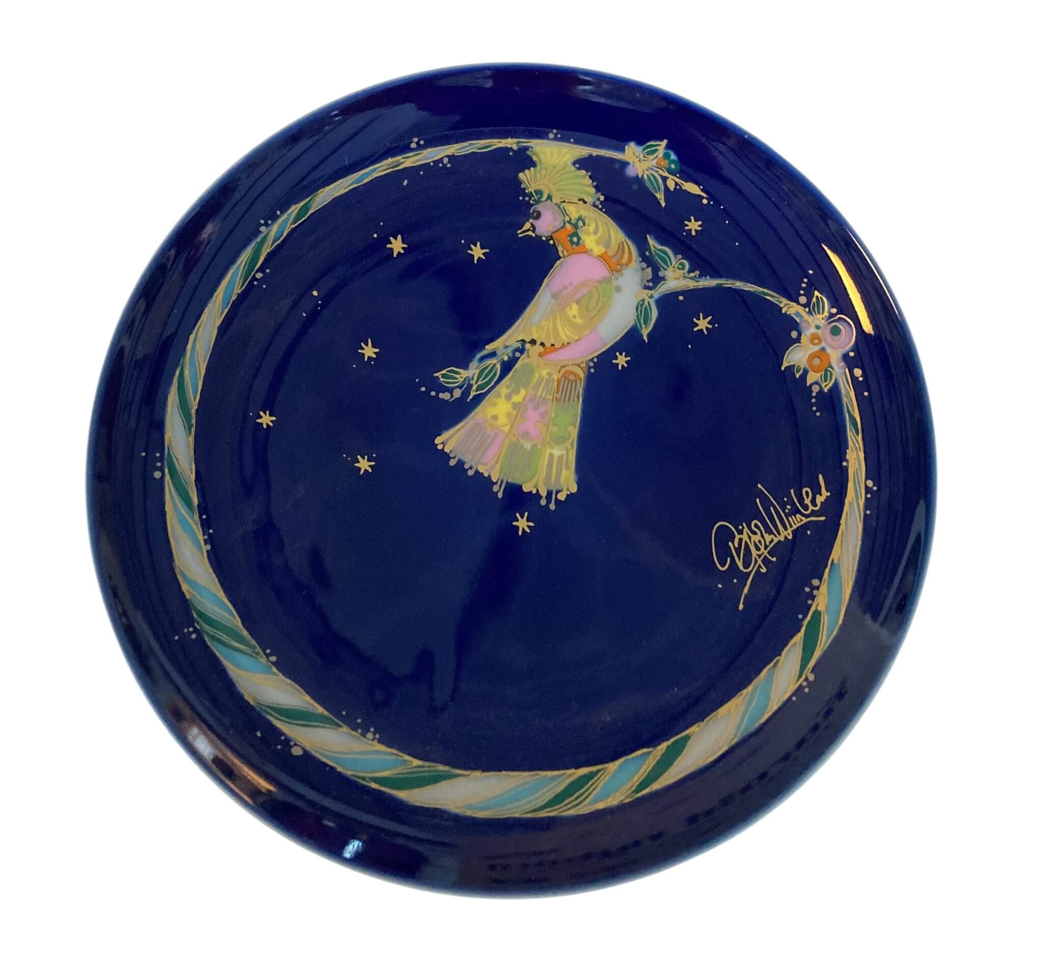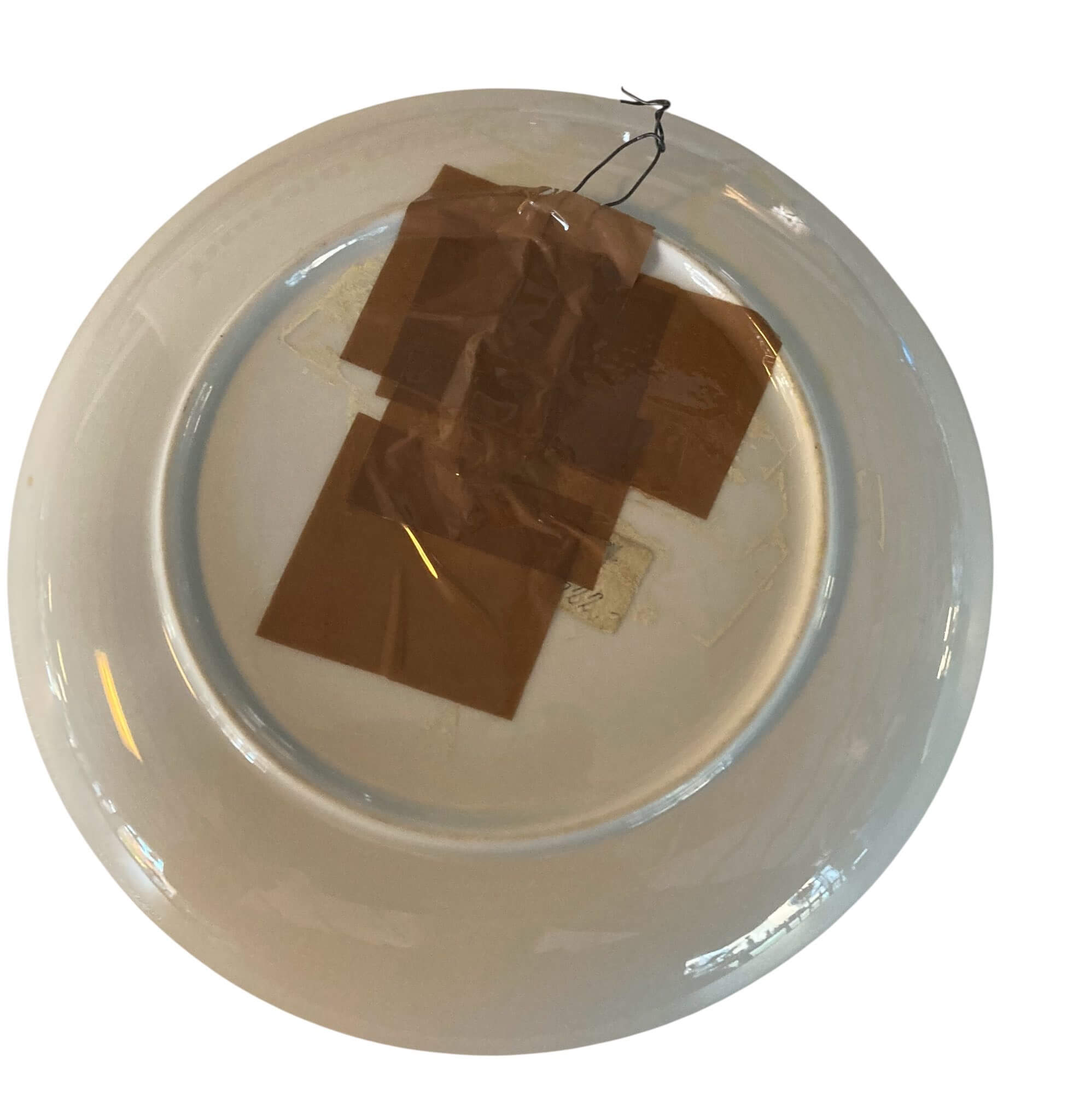 Sjælden mindre tallerken, som måler 20 cm ø i klare farver. Tape på bagsiden, holder en dims til ophæng. Kan nemt fjernes.