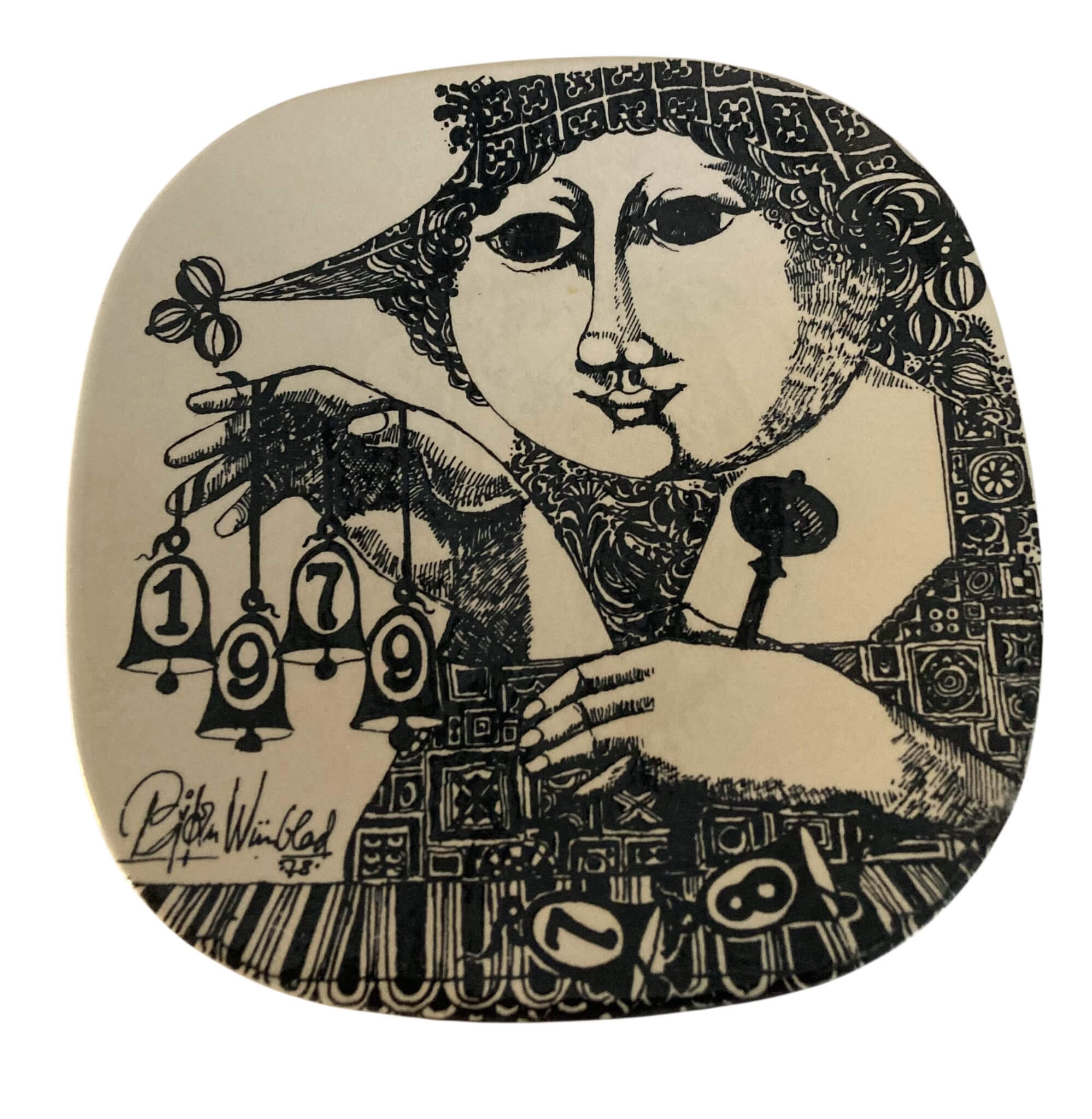 Firkantet lille fad eller tallerken, som måler 19 x 19 cm, med årstallene 78,79.