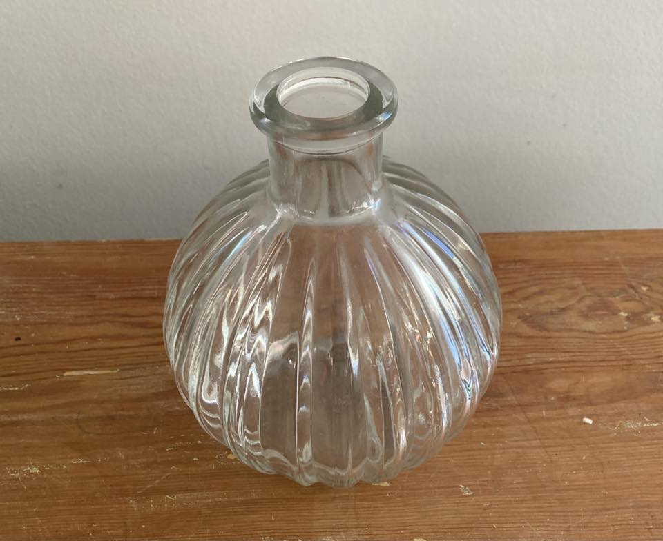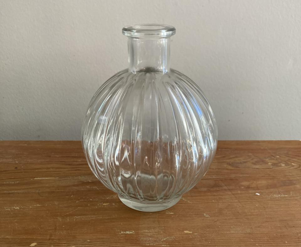 Den er både fin og robust på samme tid, denne kannelerede vase i glas. den måler 16 cm h og er 12,5 cm ø.