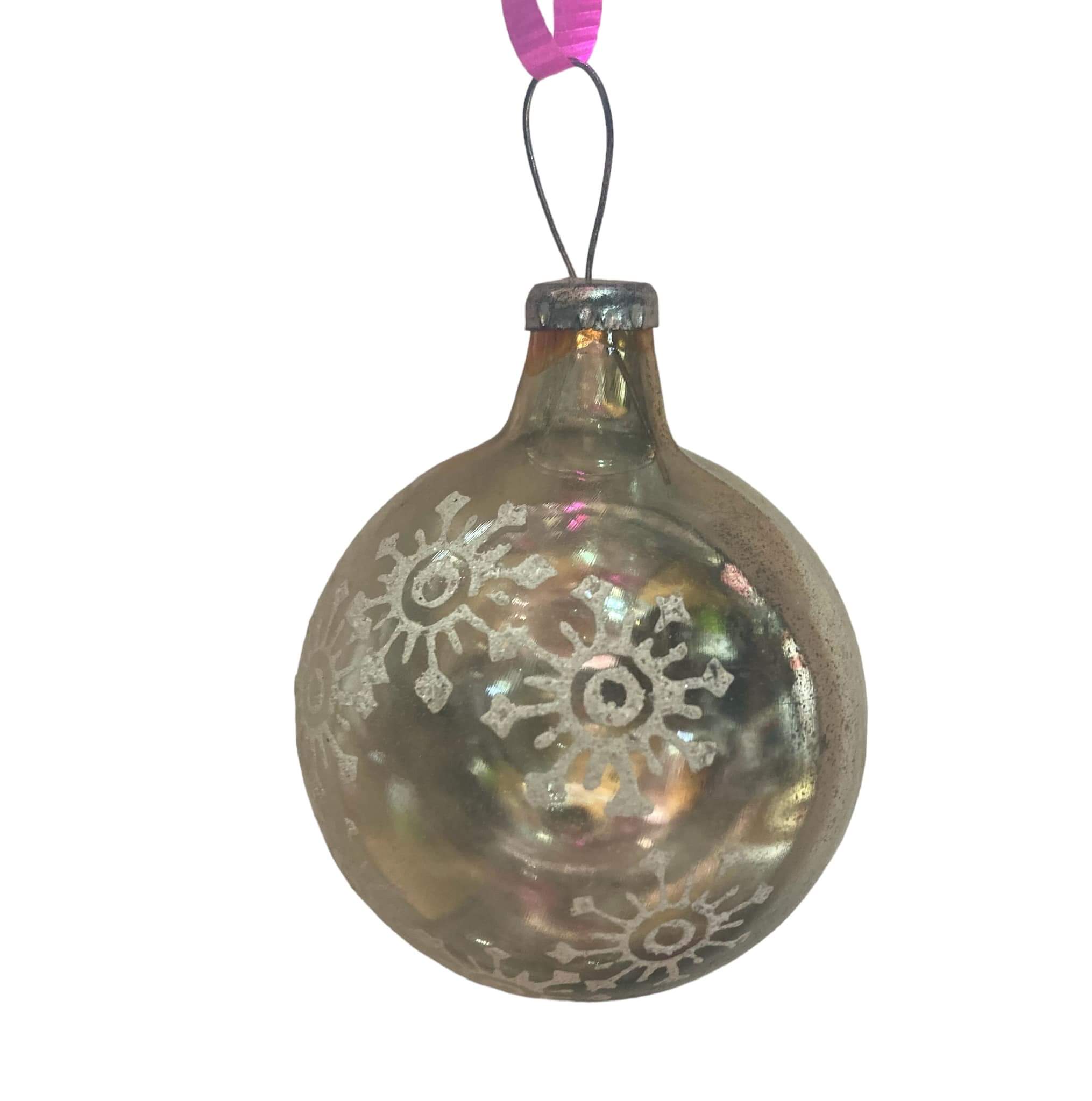 2 delt julekugle i lys sølvfarvet med sølv baggrund og gennemsigtig front med snefnug. 150,-