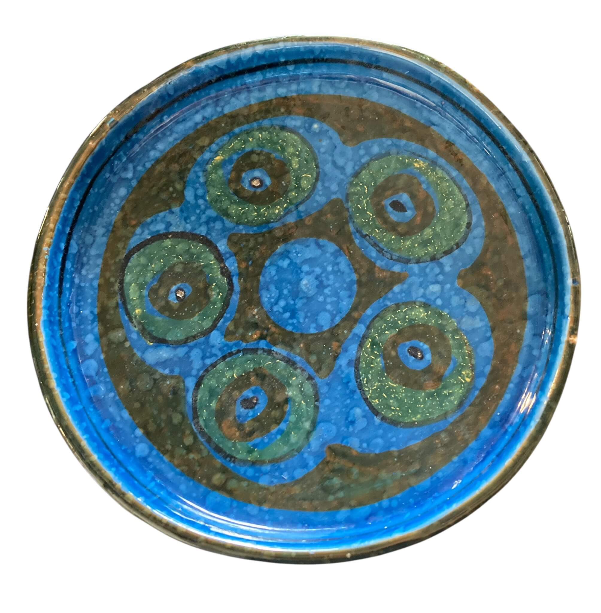 Rundt keramik fad i grønne og blå farver, som måler 21 cm Ø