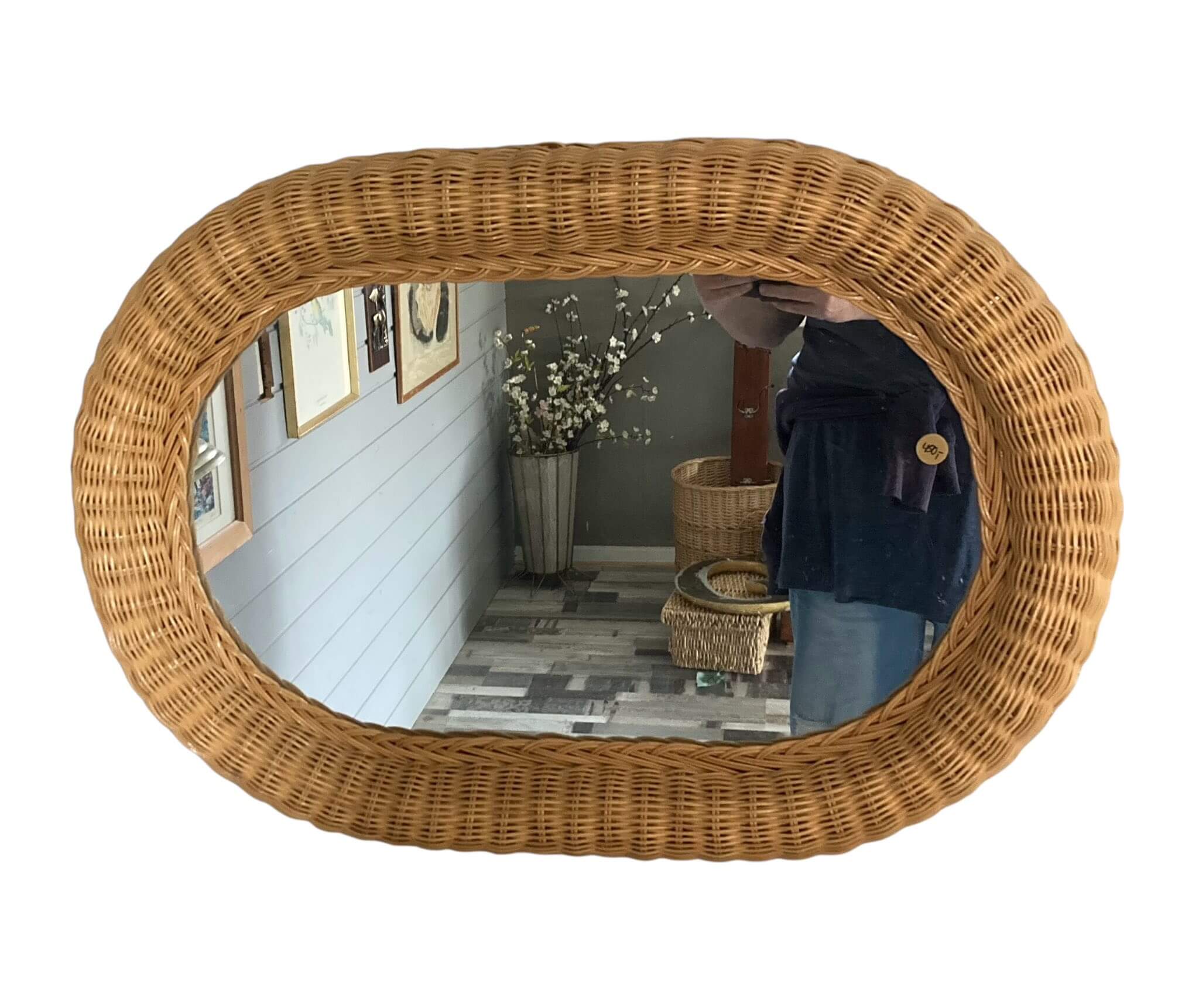 Jammen altså, se lige det her spejl, med ramme i kurveflet. det måler 70 x 49 cm.