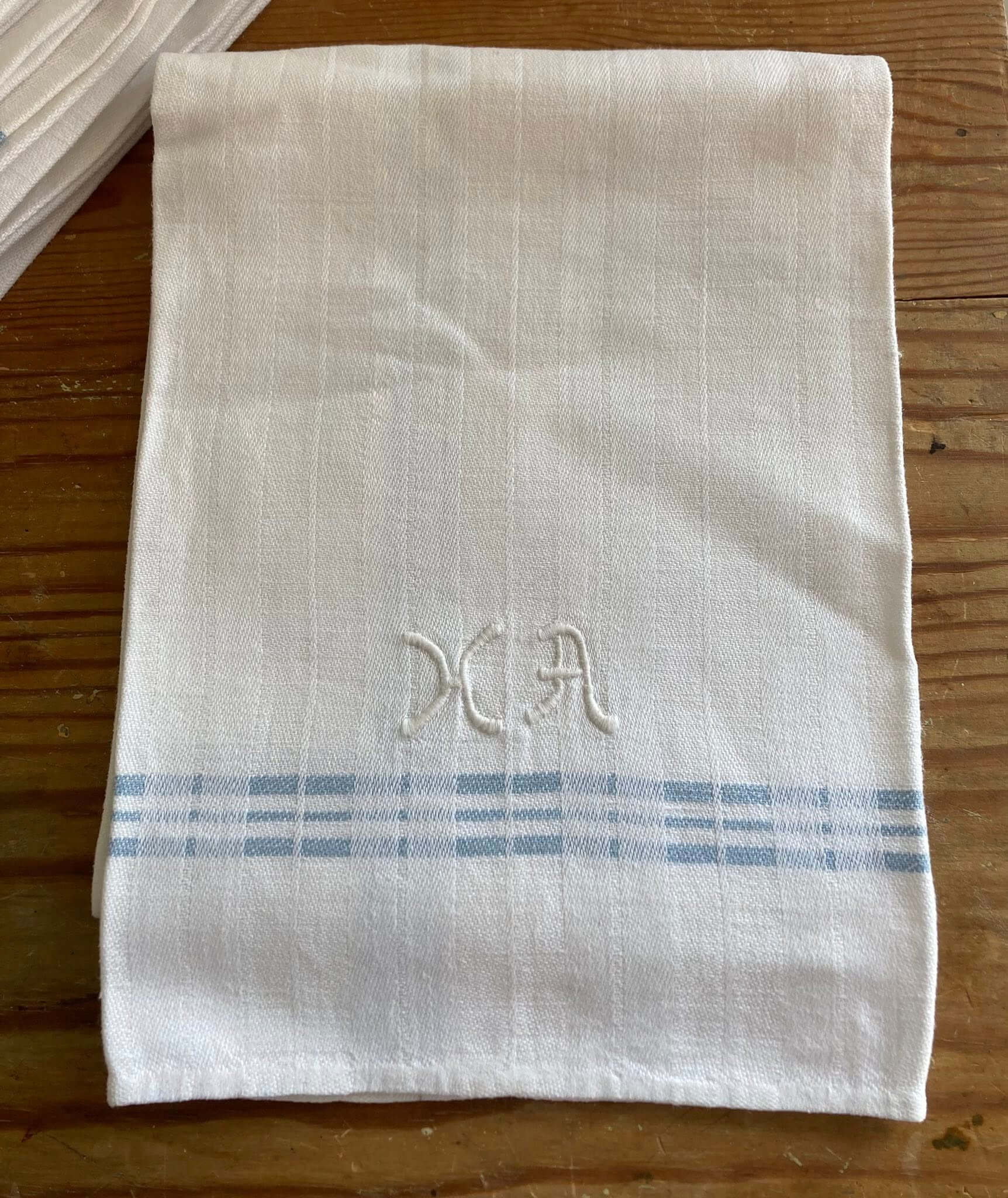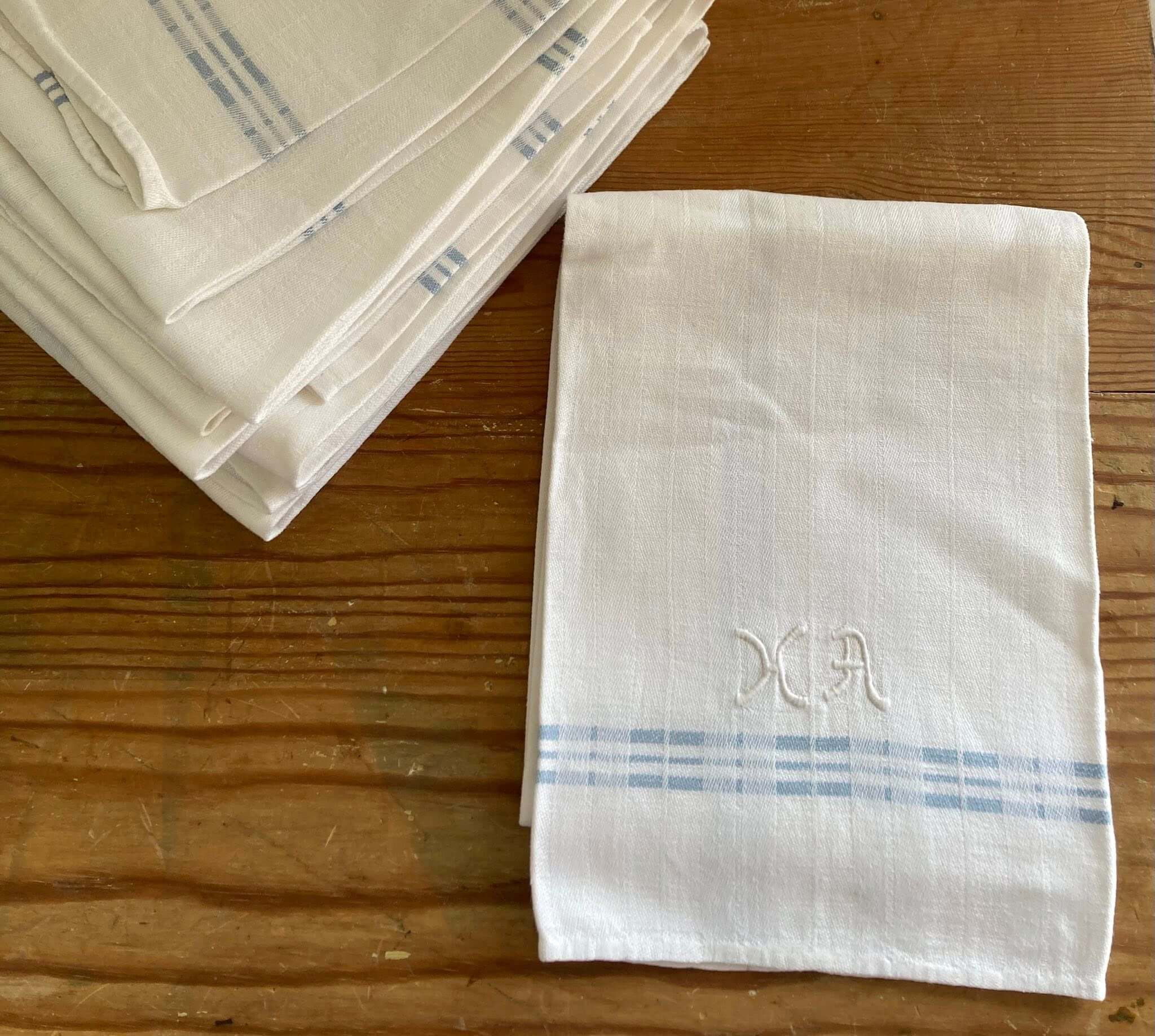 Velholdte gamle viskestykker i hvide med blå striber og monogram